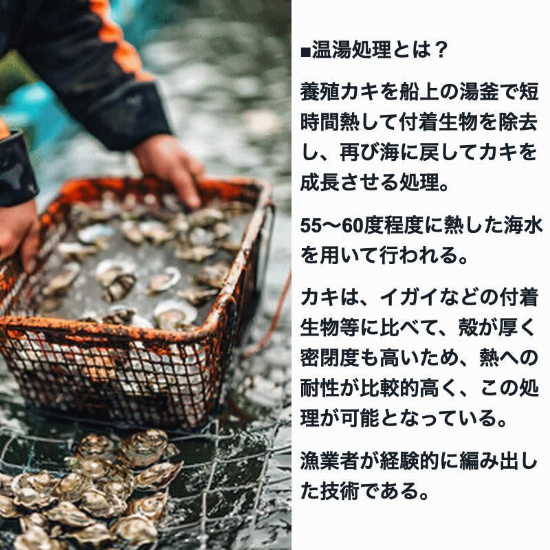 カキは、イガイなどの付着生物等に比べて、殻が厚く密閉度も高いため、熱への耐性が比較的高く、この処理が可能となっている。