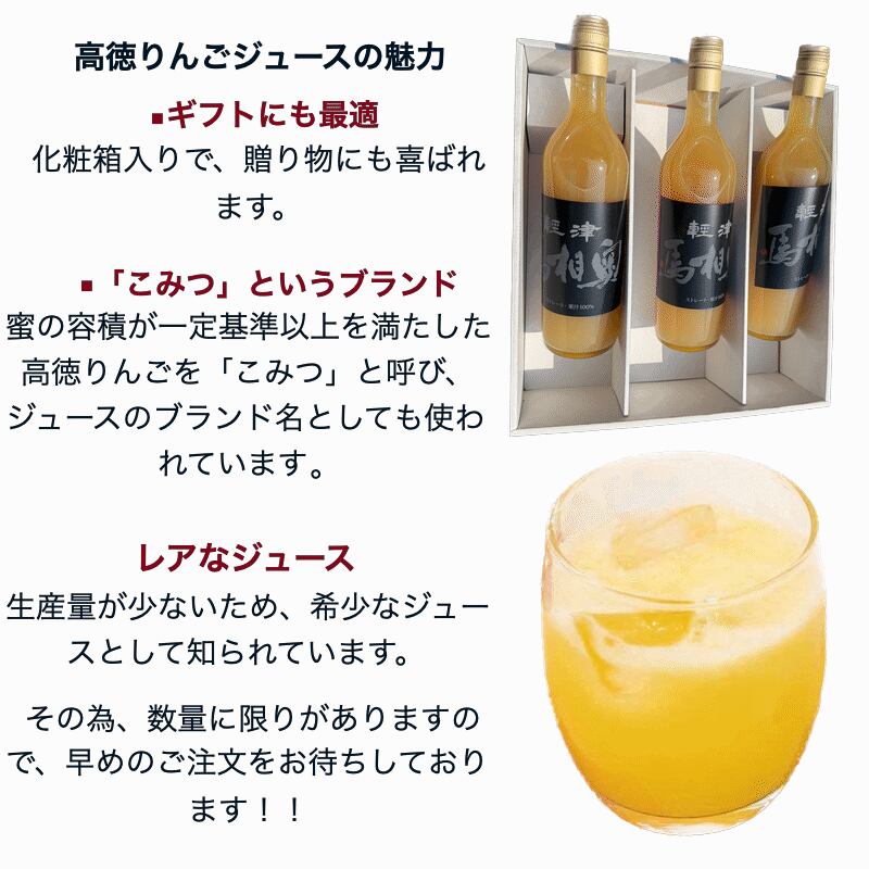 リンゴジュース 青森県産 100%ストレートりんごジュース 高徳 こみつ 無添加 720ミリリットル×3本セット 瓶入り 化粧箱入 贈答用 送料無料