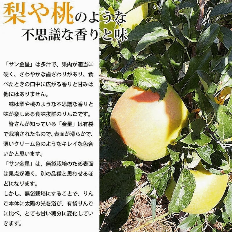 サン金星とは、りんごの「金星」という品種を袋をかけずに(無袋で)栽培したものです。