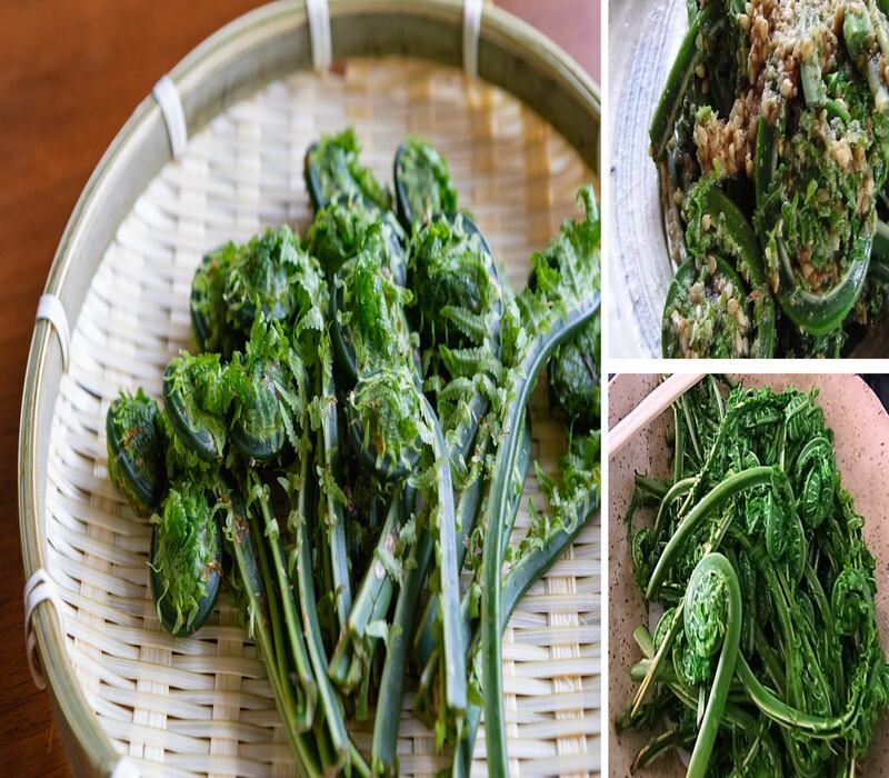 こごみから始まって、みず、うど、こしあぶら、わらび、タラの芽と季節によって変わります。