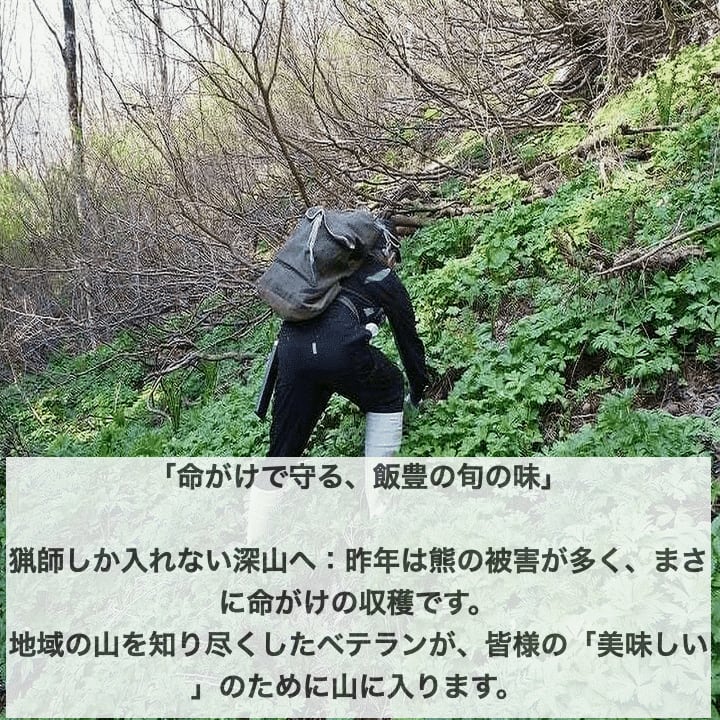 猟師しか入れない深山へ:昨年は熊の被害が多く、まさに命がけの収穫です。地域の山を知り尽くしたベテランが、皆様の「美味しい」のために山に入ります。